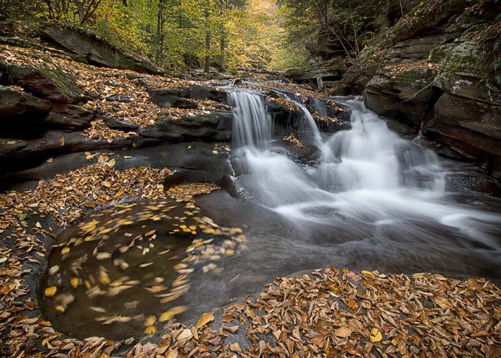 There are two lens filters that come in handy when you're taking photos at Ricketts Glen State Park. An ND (Neutral Density) filter will enable you to take creative water blur long exposure photos. A circular polarizing filter (CPF) will help reduce reflections and improve saturation in color.